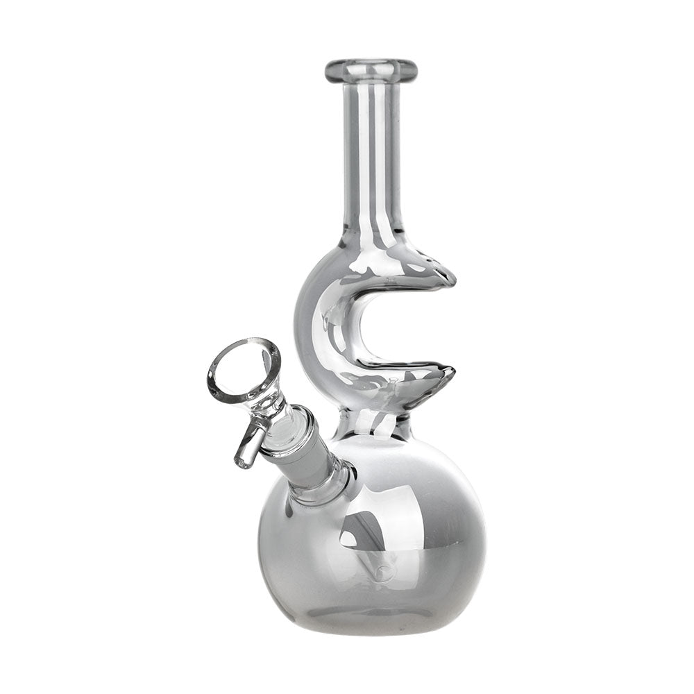 The Bear Buddy Electroplated Water Pipe stands 7.25 inches (18.4m) tall and has a crescent moon design in the neck, as well as an electroplated, metallic finish. Made of quality borosilicate glass, this water pipe includes a 14mm singular downstem herb slide. Colors vary.