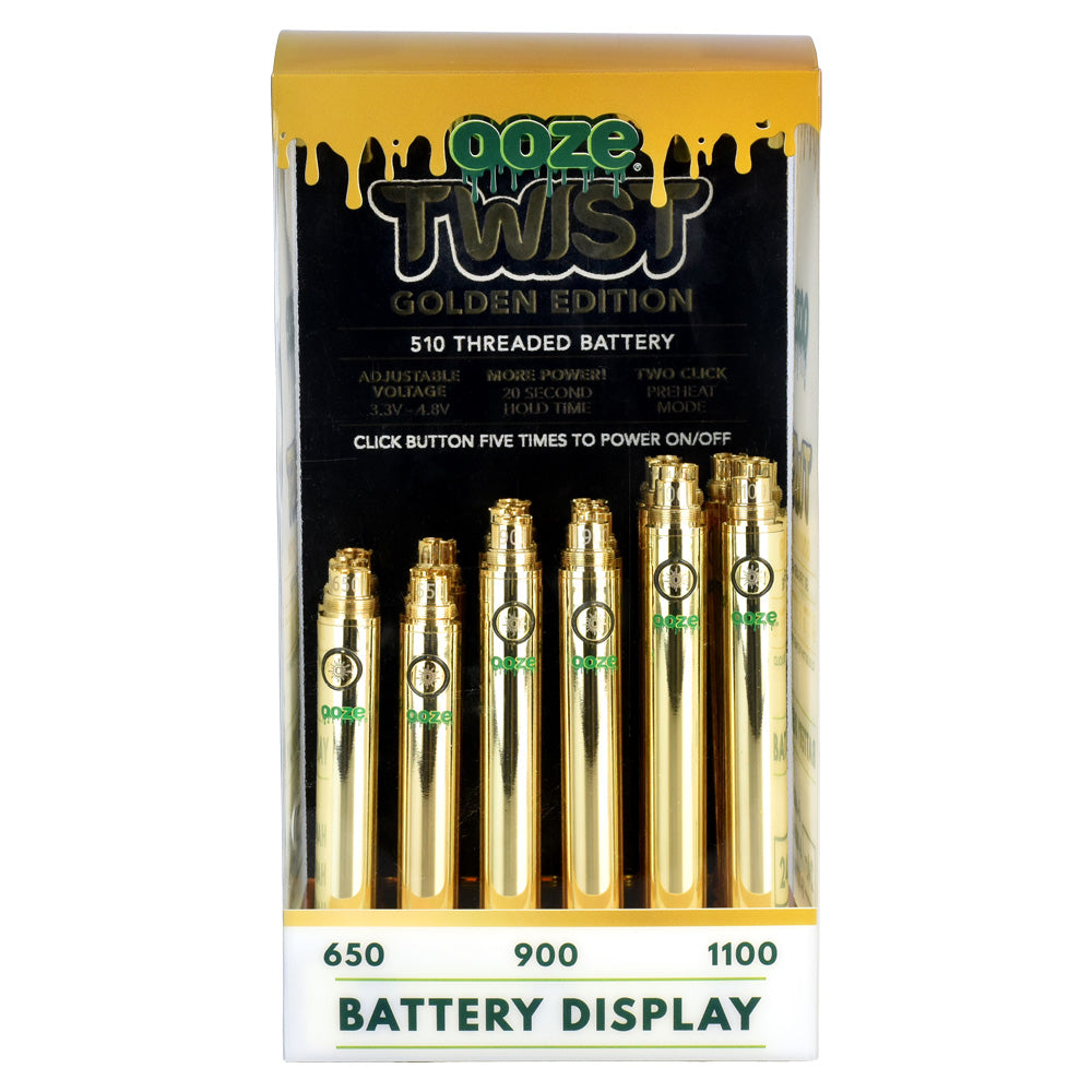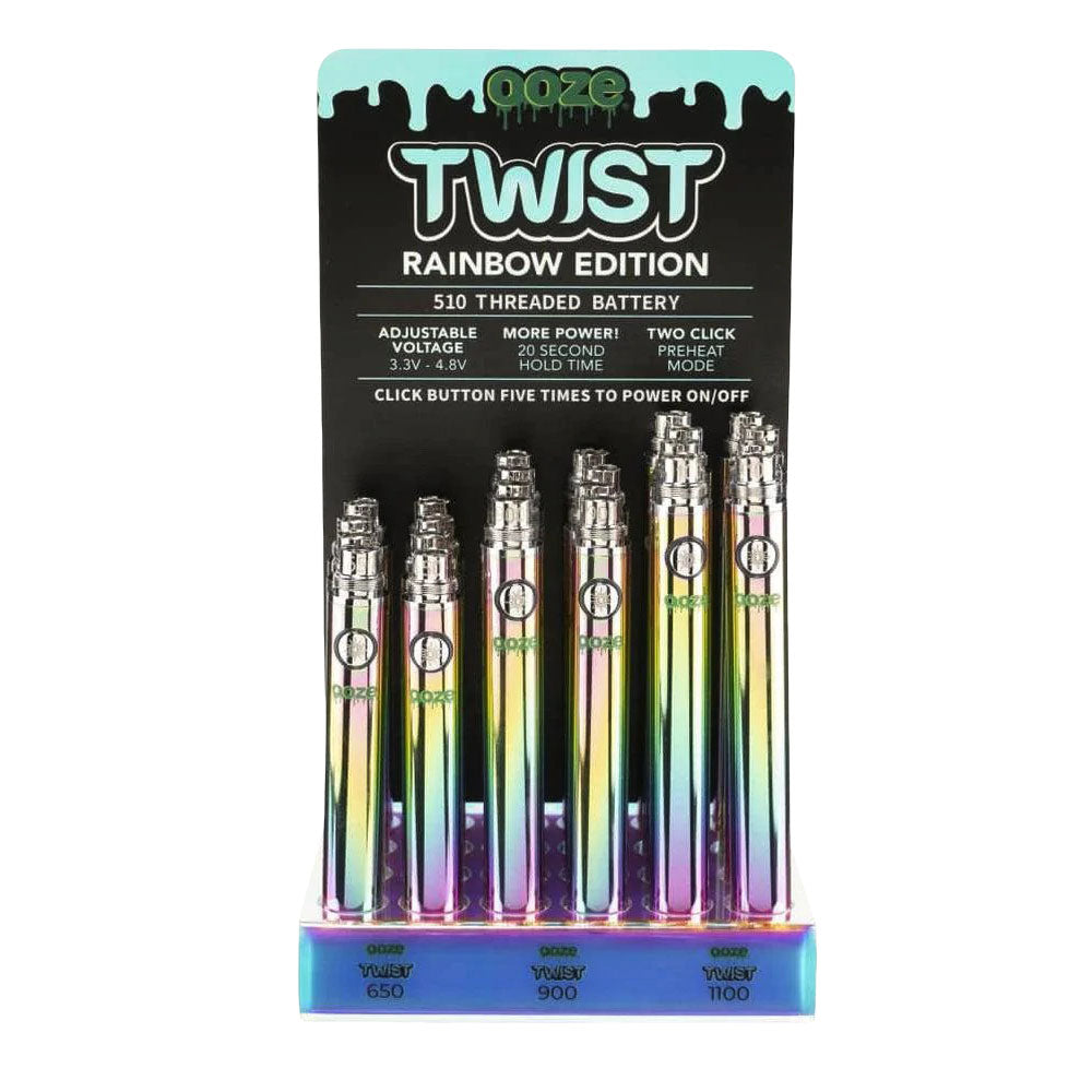 The Ooze Twist Variable Voltage Battery Display features (24) 650, 900 and 1100 mAh Twist grade A variable voltage batteries in various strengths and sizes to show the Ooze 650, 900 and 1100 mAh Twist Grade A adjustable voltage batteries (3.3V - 4.8V). These batteries feature 20sec auto-shut-off, 5-Click on/off function, overcharge protection chip, and 510 threading. Available colors include Black & Chrome, Rainbow, or Gold. NOTE: Charger NOT Included.